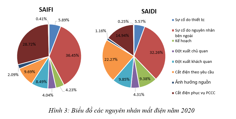 Theo số liệu thống kê, tỉ trọng các nguyên nhân mất điện trong năm 2020 (Hình 3), thì các nguyên nhân mất điện do sự cố gây ra bởi các yếu tố bên ngoài và cắt điện phục vụ phòng cháy chữa cháy chiếm tỉ trọng lớn (lần lượt là 36%, 29% đối với SAIFI và 32%, 15% đối với SAIDI). Theo đó, Tổng công ty cũng đã đưa ra các giải pháp phù hợp để giảm mất điện đối với các nhóm nguyên nhân này: