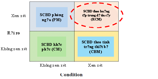 Khái niệm chính trong sửa chữa bảo dưỡng giúp phân biệt giữa CBM và RBM là việc triển khai nguyên tắc sửa chữa bảo dưỡng tập trung vào độ tin cậy (RCM) trong RBM. RCM xem xét cả hai khía cạnh là tình trạng của thiết bị và rủi ro hư hỏng của tài sản như được trình bày trong hình dưới đây.