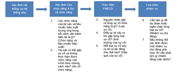 04 bước chính trong việc phân tích RCM: (i) xác định hệ thống và hệ thống phụ - Identify System and Subsystems, (ii) xác định chức năng và sự cố liên quan đến chức năng – Identify Functions & Functional Failures, (iii) thực hiện FMECA - phân tích các loại ảnh hưởng và tính nghiêm trọng của hư hỏng (Failure modes, Effects and Criticality Analysis), (iv) lựa chọn nhiệm vụ - Task selection.